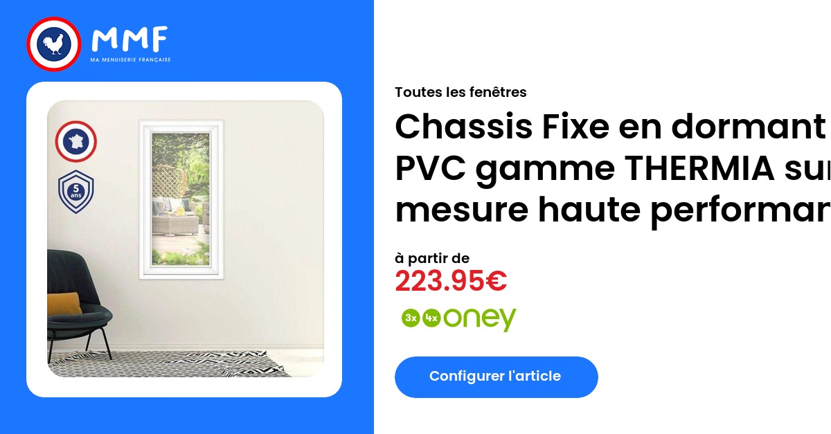 Le châssis fixe en dormant PVC gamme THERMIA de Ma Menuiserie Française allie performance énergétique et design élégant pour votre habitat. Fabriqué en France avec des matériaux de qualité supérieure, ce châssis fixe sur mesure apporte lumière naturelle et isolation optimale dans chaque pièce de votre maison.
