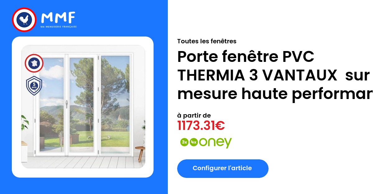 La porte fenêtre PVC THERMIA 3 VANTAUX sur mesure haute performance est un produit haut de gamme technique proposé par Ma Menuiserie Française. Conçue sur mesure et fabriquée en France, cette fenêtre est idéale pour les projets exigeants, que ce soit en construction neuve ou en rénovation.